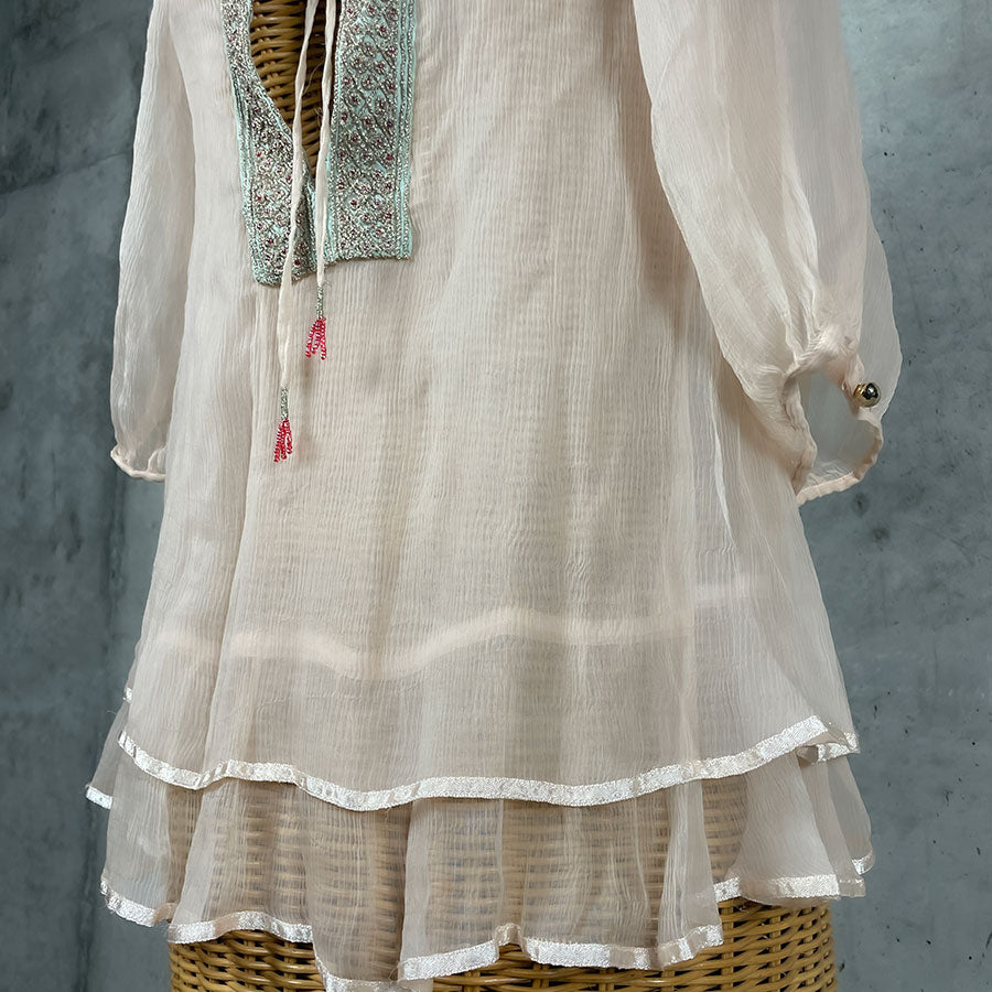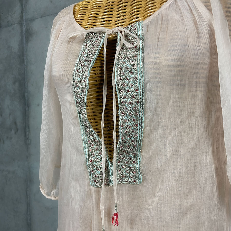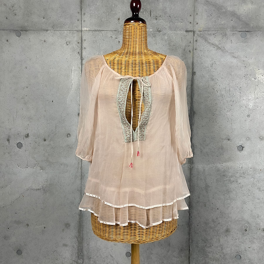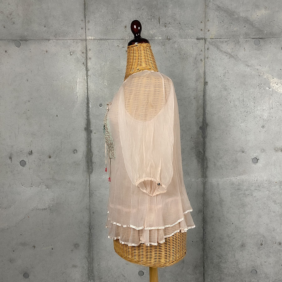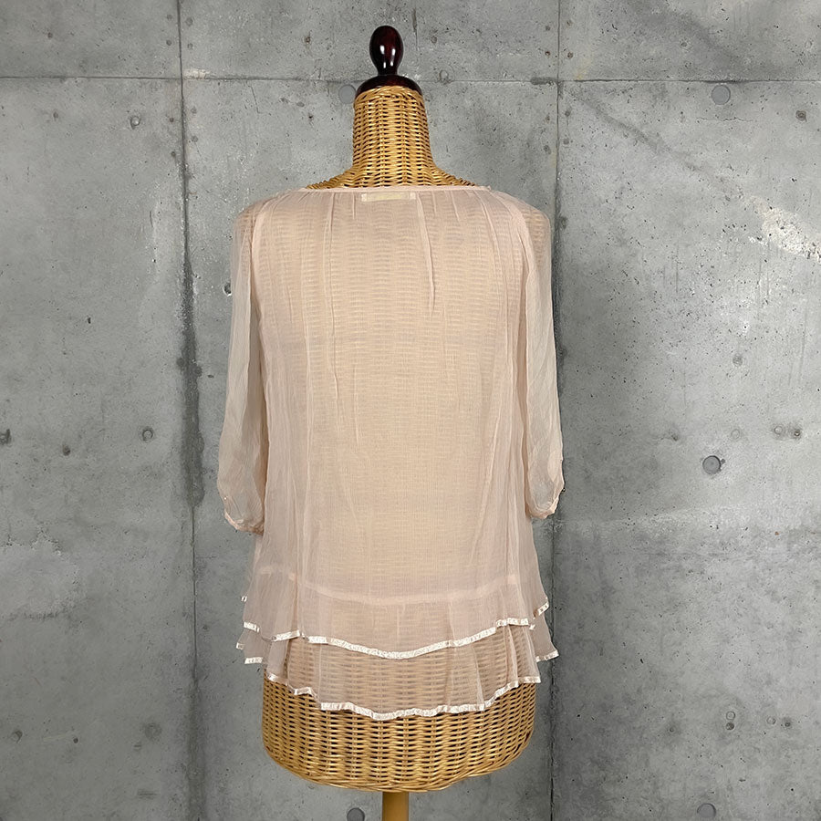 薄いベビーピンクのシフォンブラウス。