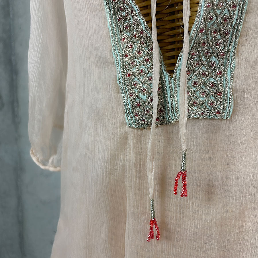 胸元のビーズや紐の先に装飾が付いたデザインが印象的です。