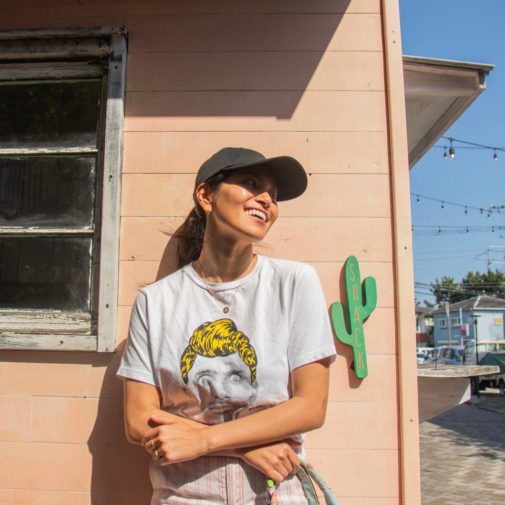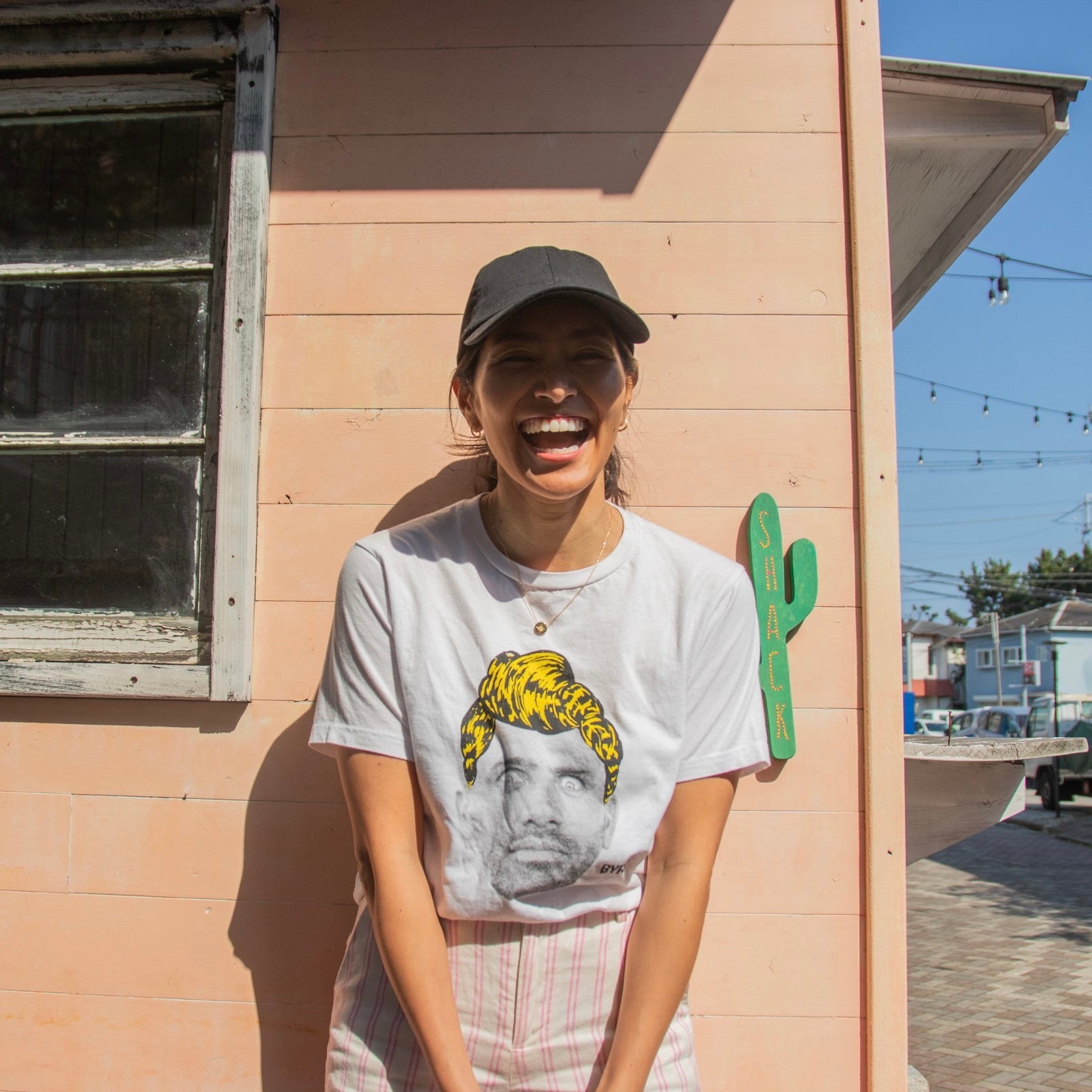 ケリースレーターが髪の毛があるグラフィックが面白いTシャツです。